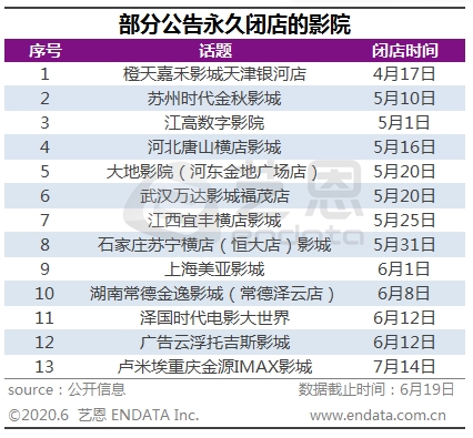 疫情已致使很多影院陷入生存困境,极度依赖现金流的影院由于收入结构单一,缺失票房来源后,无法支付高额的房租、物业和人力费用,已倒在了影院复工之前。据艺恩数据的不完全统计,截至6月19日,已有至少13家电影院宣布永久闭店。而企查查数据显示,截至今年7月14日,我国共有12421家经营范围含“影视”的企业注销。