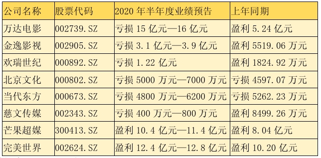 据不完全统计,截至目前,已有8家影视公司发布了2020年半年度业绩预告,除芒果超媒和完美世界保持盈利外,其他公司均出现了不同程度的亏损。其中,除北京文化和当代东方继续亏损外,其他公司都是同比由盈转亏,业绩大幅下跌。