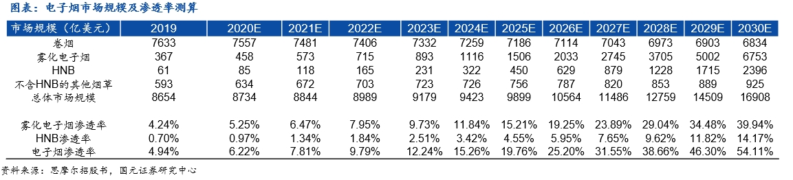 参考招股书弗若斯特沙利文对于雾化电子烟和加热不燃烧烟(测算得出)的2019-2024年复合增速,我们假设雾化电子烟2019-2030年复合增速为24.9%,HNB2019-2030年复合增速为39.7%;