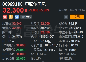 富途资讯21日消息,思摩尔开盘涨5.9%报32.3港元,当前总市值达1855.15亿港元。