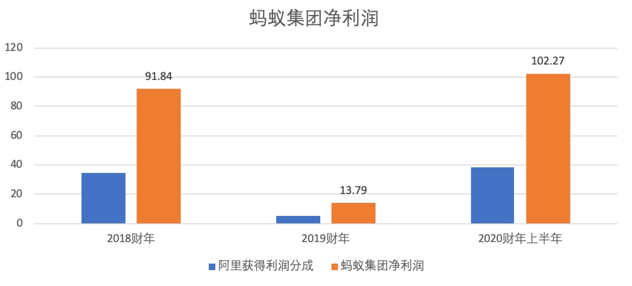 阿里巴巴在2018、2019财年和2020财年中的6个月(从2019年4月至2019年9月)从蚂蚁集团方面获得的利润分成分别为34.44亿元、5.17亿元和38.35亿元,而2019年9月利润分成停止至2020年3月31日,阿里巴巴从蚂蚁方面获得以投资权益的形式表现为53.24亿元。