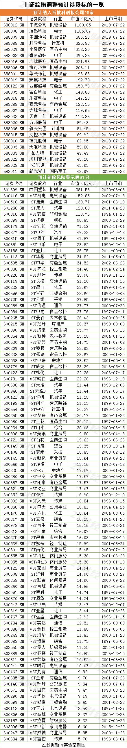 7月22日,上证综指编制方案正式修订,这是上证综指诞生以来首次大修改。中微公司、澜起科技、中国通号、虹软科技、睿创微纳等25家科创板公司或被纳入。