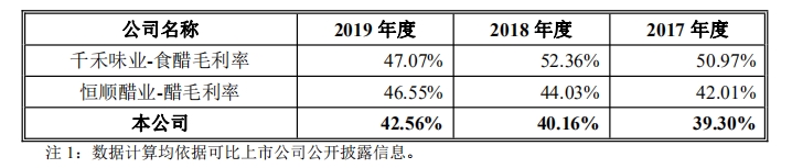 财务数据显示,报告期内紫林醋业毛利率分别为39.30%、40.16%、42.56%,均小于可比企业。