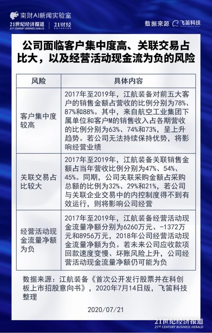 江航装备于7月14日发布的招股说明书中提示了多个风险。经南财AI新闻实验室梳理,有三大风险点跟公司经营高度相关,分别是客户集中度较高、关联交易占比较,以及经营活动现金流量净额为负的风险。