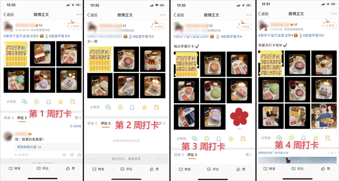 甚至有网友为了“吃垮”麦当劳,每天都在微博上打卡麦当劳早餐,一连吃了四个礼拜。