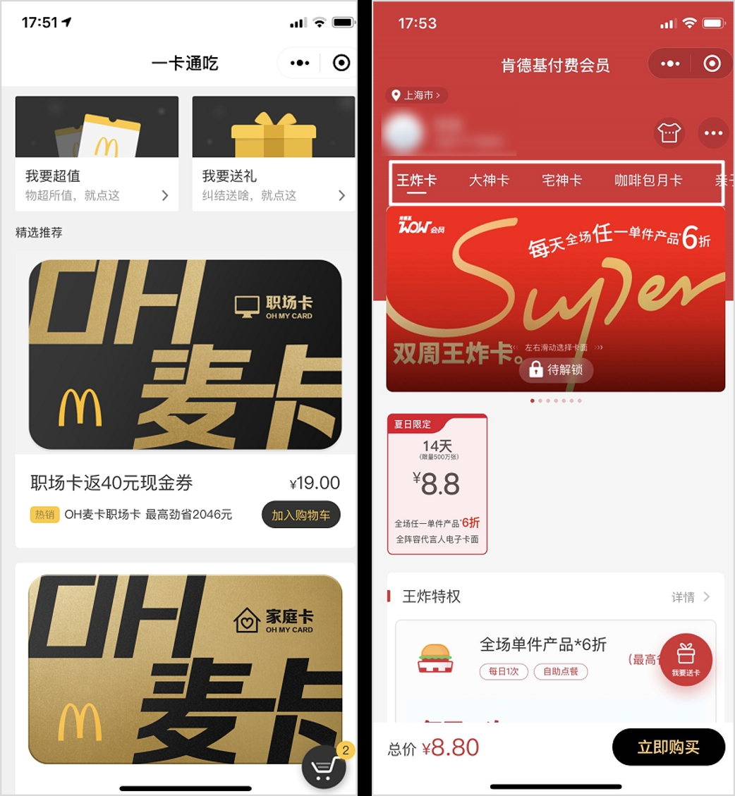 对于那些不想每天蹲守 App 抢券的用户,肯德基和麦当劳还推出了很多的付费会员卡。