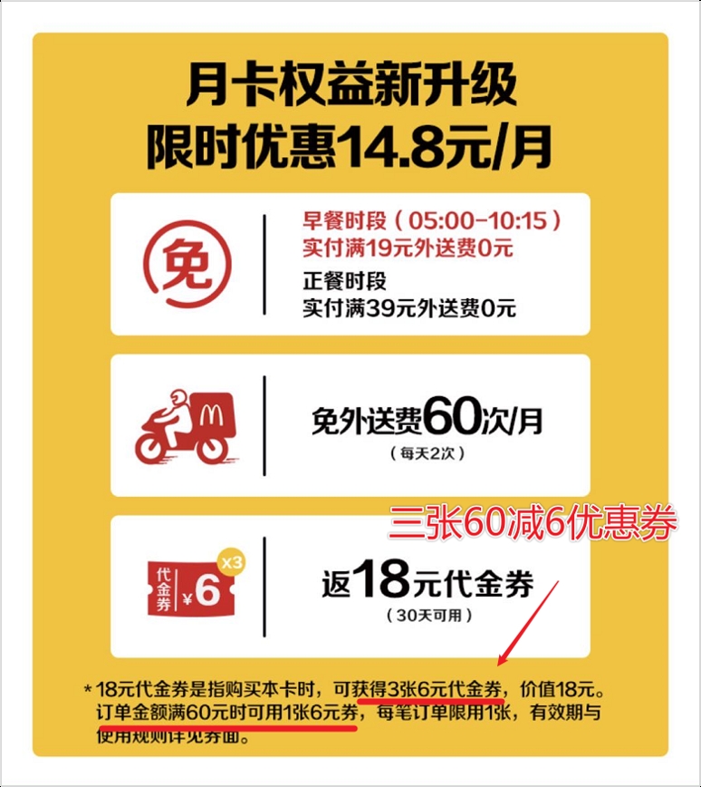 像麦乐送卡 14.8 元一个月,为了让会员费看起来没有那么贵,麦当劳表示只要办卡,就送18 元代金券。这么算下来,好像买张卡还能净赚 3 块 2 ?