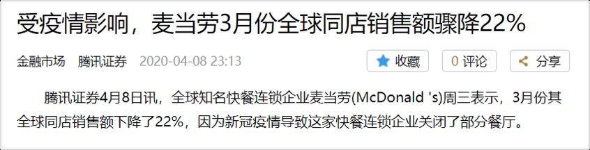 受到疫情的影响,肯德基和麦当劳的日子都不好过。根据腾讯证券的报道,光是在 3 月份,麦当劳同店销售额下降了22%,不少门店甚至因此关闭。肯德基也差不多。