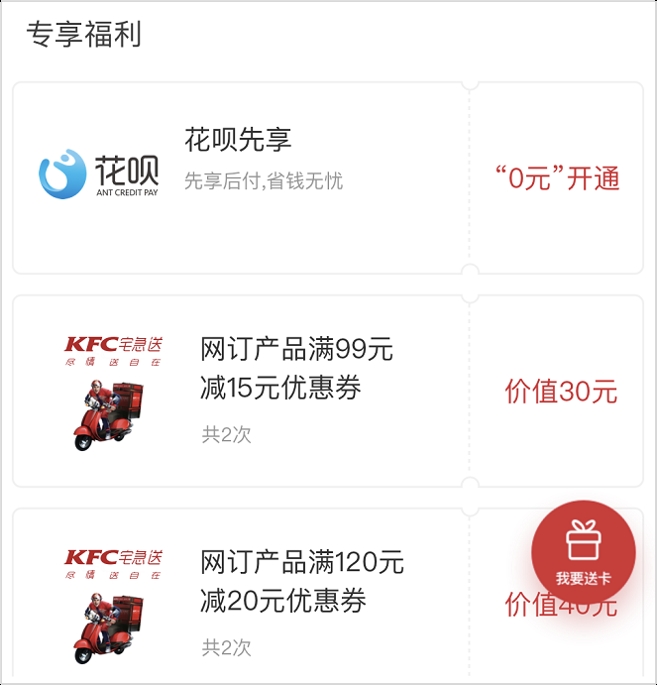 还是肯德基最火的大神卡,里面有个专属福利,用户可以领取 4 张外送满减券。但是最低门槛也要买够 99 元,想要用掉优惠券,只能买买买。