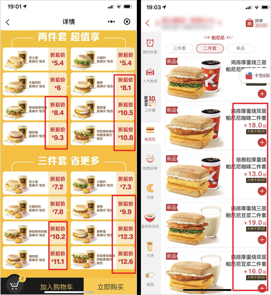 ▲左图:麦当劳早餐卡;右图:肯德基大神卡