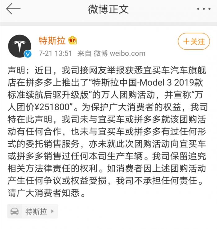 7月21日下午特斯拉在微博发布声明:近日,我司接网友举报获悉宜买车汽车旗舰店在拼多多上推出了“特斯拉中国-Model 3 2019款 标准续航后驱升级版”的万人团购活动,并宣称“万人团价¥251800”。为保护广大消费者的权益,我司特在此声明,我司未与宜买车或拼多多就该团购活动有任何合作,也未与宜买车或拼多多有过任何形式的委托销售服务,亦未就此次团购活动向宜买车或拼多多销售过任何本司生产车辆。我司保留追究相关方法律责任的权利。如消费者因上述团购活动产生任何争议或权益受损,我司不承担任何责任。请广大消费者知悉。