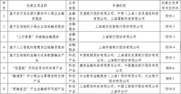 7月21日,上海金融科技创新监管试点工作组在广泛征集项目的基础上,对外公示上海市首批8个创新应用。其中,交通银行、浦发银行、上海银行、上海华瑞银行、中国银联、建信金融科技、兴业数金、上海聚均科技及工行上海分行的项目入围。