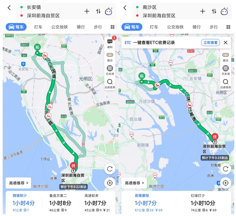 东莞长安、广州南沙开车到前海,都需要1个小时以上。