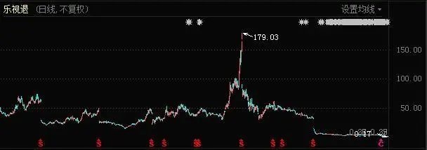 它曾是A股创业板“一哥”,股价一骑绝尘。历史高点179.03元/股(除权价),如果以当天贵州茅台最高价275.2元/股算,乐视网股价是茅台的65%,相当于“大半瓶茅台”。