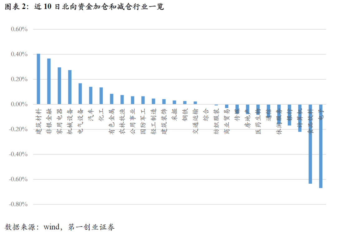 从持仓占比的变化角度看,外资加仓建筑材料、非银金融、家用电器、机械设备、电气设备等行业,减仓休闲服务、银行、计算机、食品饮料、电子。