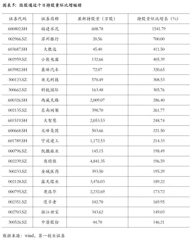 从持股量的增仓幅度来看,7月13日至7月20日,持股量环比增幅在50%以上的公司有98只,环比增幅最大的是福建水泥,陆股通最新持有608.78万股,持股量环比增幅达1541.79%。其次是苏州银行、大胜达、小熊电器等。