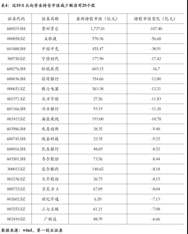 近10日北向资金减持力度较大,对10只个股的持仓市值减少超过10亿元,其中对贵州茅台的减仓超过了百亿。五粮液、中国中免等减持额亦排名靠前。