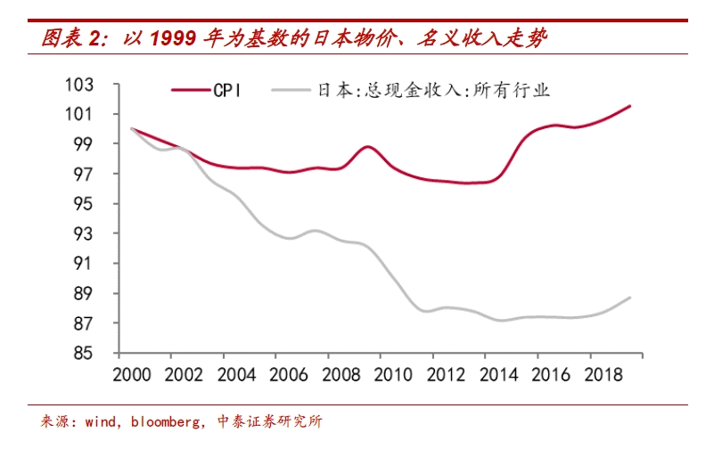 我们以1999年作为基期,考察日本居民名义工资以及物价走势。