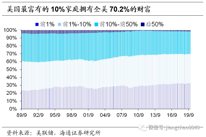 从财富占比来看,美国最富有的前10%的家庭,拥有美国70.2%的财富,而这一比例在1989年为60.9% 。