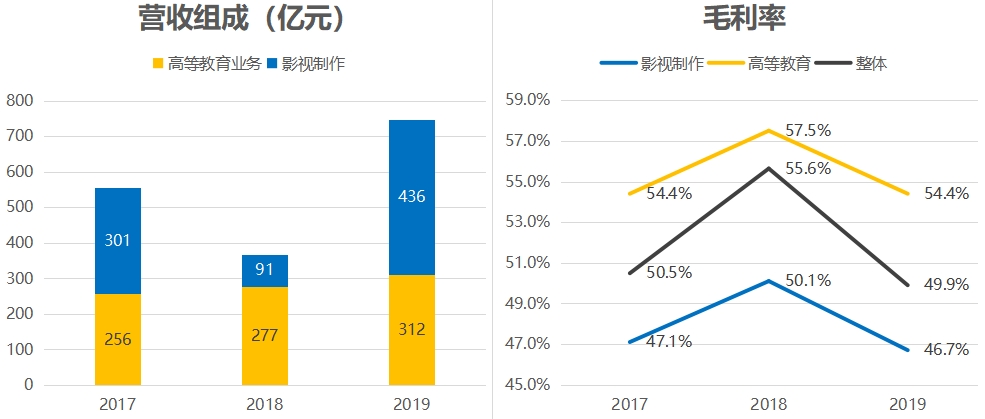 按2019年营收比例来看,教育业务占42%,而影视制作则占58%。