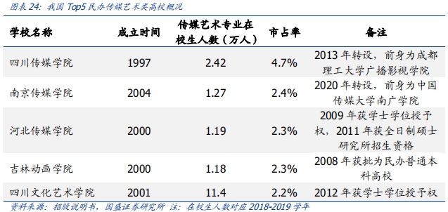 2.传媒艺术类教育:主要为公司运营的南京传媒学院(前称为中国传媒大学南广学院),学校位于江苏省,提供本科教育,课程涵盖50个专业,重点为媒体和表演艺术,于2019/2020学年拥有本科及专升本学生共1.43万人。