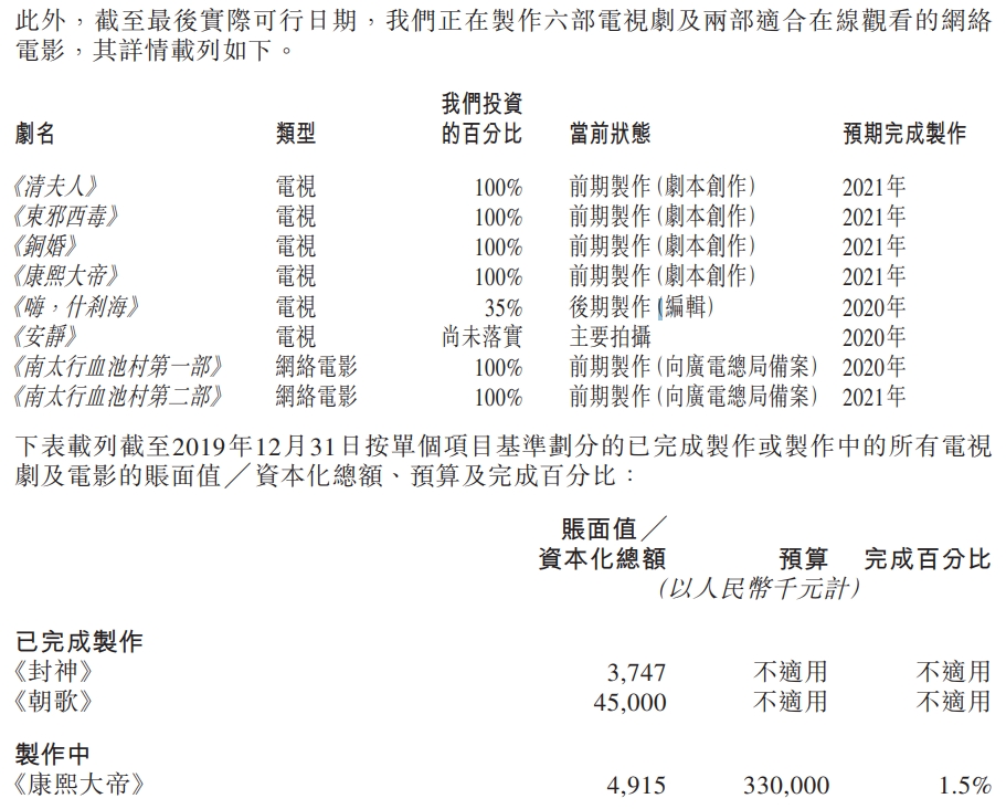 相反,影视制作方面,基于拍摄及制作活动受阻,交付最终作品可能有所延迟,其中预期原定于今年年底交付的独资电视剧《铜婚》已延迟至2021年。