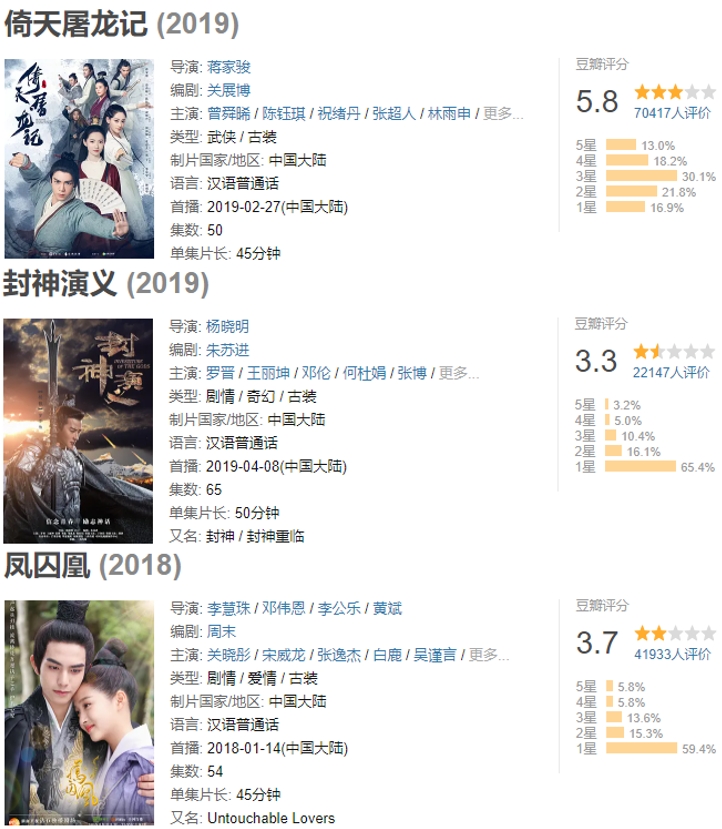 以2019年上映的新版《倚天屠龙记》为例,虽然仍然能为公司带来了不少收益,但在豆瓣评分其实不高,仅获得5.8分,被吐槽的点也很多。