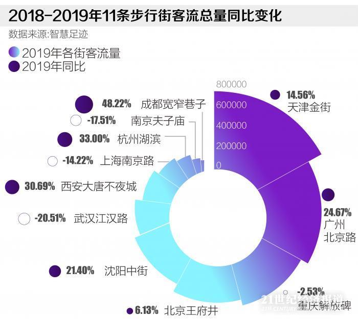 21世纪经济研究院近期发布的《2020中国步行街智能化发展报告》显示,2019年,首批11条步行街总客流量超过9亿人次,增长了22.6%,实现营业收入1250亿元人民币,增长17%。