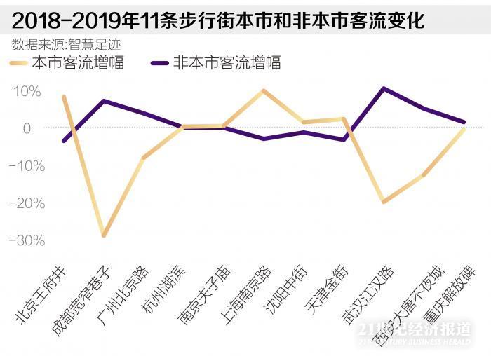 11条步行街本市、本省和外省客流来源地分布大约为4:2:4。同比分析2019年本市和非本市客流量占比发现,上海南京路步行街和北京王府井本市客流增幅最高,分别为8.7%和7.3%。