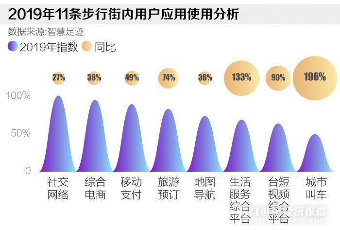 报告指出,基于步行街改造计划中智慧服务、线上线下融合及软硬件等指标分析,2019年11条步行街区域内用户使用量最多的移动智慧服务前5排序如下:社交网络(微信)、综合电商(例如京东)、移动支付类(例如京东支付)、旅游预订(携程)、地图导航(百度地图)。