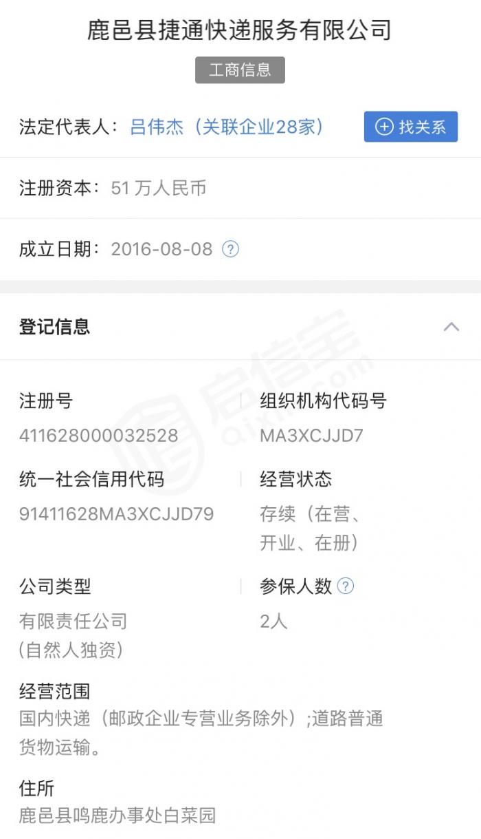 启信宝显示,涉事的鹿邑县捷通快递服务有限公司成立于2016年8月,注册资本51万,法定代表人为是吕伟杰,经营范围包括国内快递(邮政企业专营业务除外);道路普通货物运输,由吕伟杰全资持股。