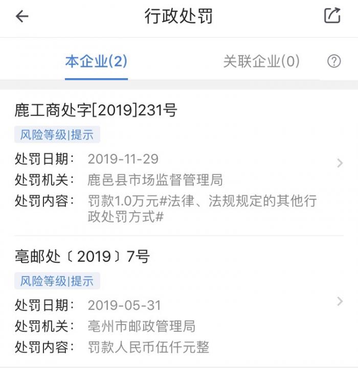 值得注意的是,该公司曾于2019年2次受到行政处罚。其中,2019年5月,因超地域范围经营,被亳州市邮政管理局罚款人民币5000元整;同年11月,该公司因违反登记管理行为,被鹿邑县市场监督管理局罚款1万元。