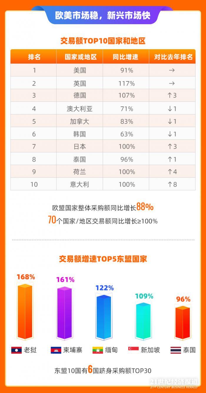 7月23日,21世纪经济报道从阿里巴巴国际站获悉,2020年上半年,该平台实收交易额同比增长80%(按美元计价),订单数同比增长98%,支付买家数同比增长60%。国际站平台交易额同比增速超过100%的国家和地区达到70个。美国、欧盟和东盟,是跨境电商出口的三大主要市场。美国、英国、德国分列交易额前3位,美国的增速为91%,欧盟整体增速为88%。