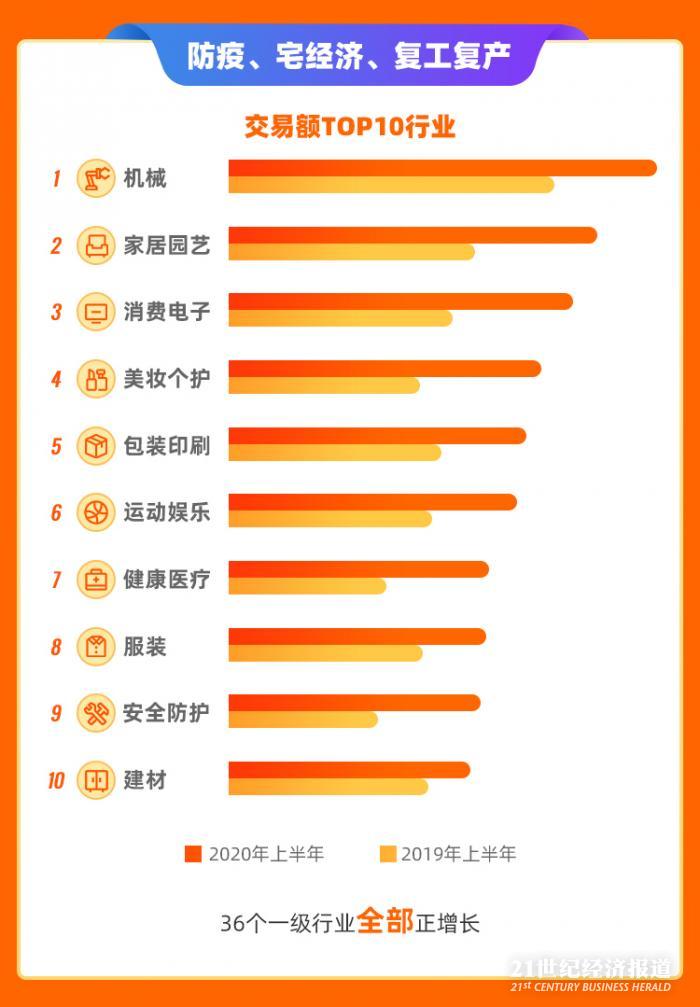 上半年,国际站平台36个一级行业均实现正增长。交易额前10的行业分别为机械、家居园艺、消费电子、美妆个护、包装印刷、运动娱乐、健康医疗、服装、安全防护和建材。行业的表现折射了疫情之下,海外需求正在经历三个阶段:防疫-宅经济-复工复产。