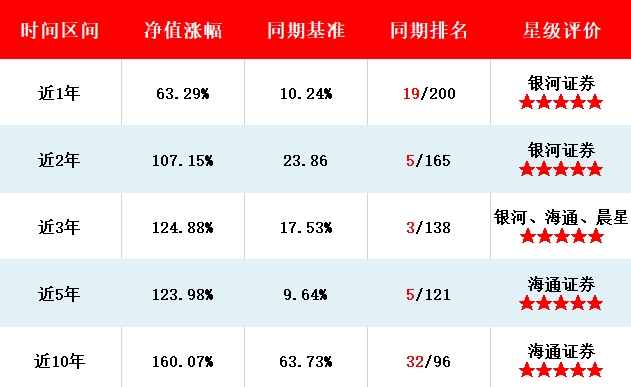 以融通行业景气(161606)为例,短中长期业绩排名均位于同类前列,并获得了多家权威评价机构的五星评级: