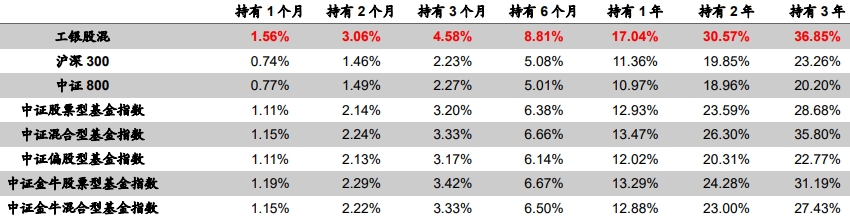 特别值得关注的是用红色字体标注的工银股混基金指数,在不同持有期下的平均收益率,都位列第一。