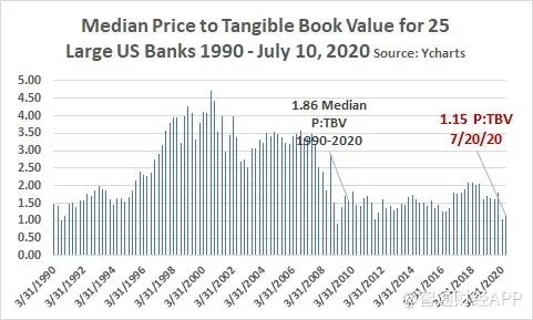 此外,据Ycharts统计,自1990年以来,美国25家大型银行的股价有形账面值比(PTBV)的中位数于至2020年7月降到最低。这意味着,今年7月,美国银行业的整体估值水平处于30年地位。