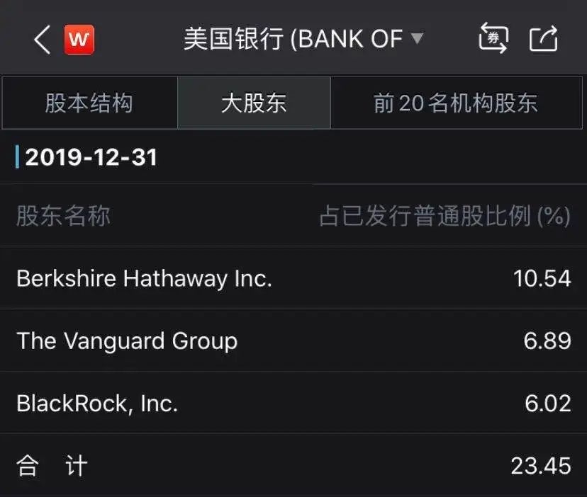 据wind数据,截至2019年末,伯克希尔持有美国银行约9.47亿股,持股比例为10.54%。