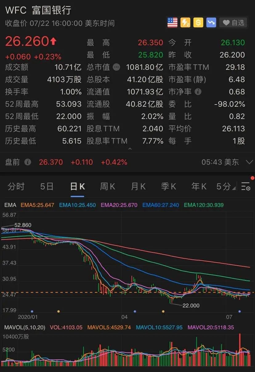 此外,富国银行还决定大幅削减三季度股息至10美分,削减幅度达到80%,这大大低于市场预期。而摩根大通、美国银行、摩根士丹利、花旗、高盛等大行均宣布维持第三季度派息不变。