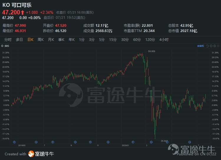 目前,公司股价较最低点35.94美元已经有所回升,但是相比于最高点仍有空间。在第二季度营收数据如此之差的情况下,市场还愿意给予上涨2.34%的正面回馈。市场对它信心充足。不过,全球疫情的影响依然在持续,第三季度营收极大可能会受到疫情的残害。不过可口可乐已经驶出曾经看不清方向的风暴中心,迎接它的未来是稳中求增的路线了。