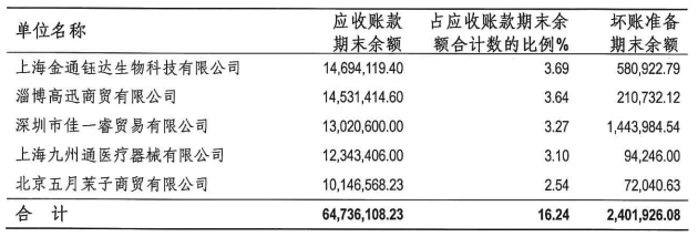 2019年公司年报显示,应收账款的前五大单位分别是金通钰达、淄博高迅商贸、深圳佳一睿、九州通和北京五月茉子商贸。