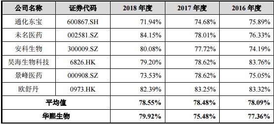 华熙生物的招股说明书里,同行业毛利率对比中显示,2016-2018年,六家同行业的毛利率都在70%以上,2018年毛利率最高的是未名医药,为84.15%。