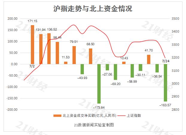 此前7月14日,北上资金净卖出173.84亿元,沪指下跌0.83%,此后两个交易日下跌5.99%。