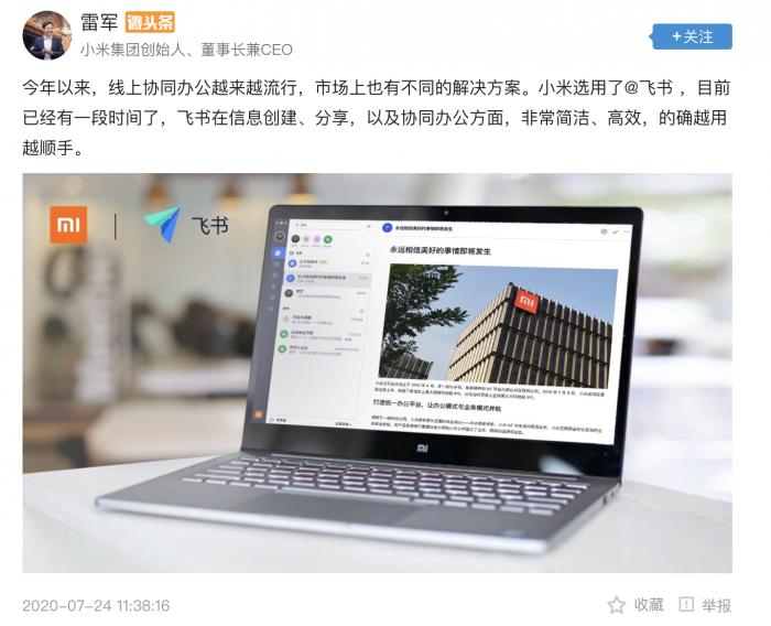 7月24日,雷军在字节跳动旗下的微头条上更新了一条动态。他表示,“今年以来,线上协同办公越来越流行,市场上也有不同的解决方案。小米选用了@飞书 ,目前已经有一段时间了,飞书在信息创建、分享,以及协同办公方面,非常简洁、高效,的确越用越顺手。”