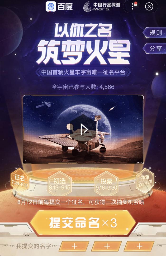征集名称提交时间截止到8月12日24时。在征集名称提交阶段,用户既可过百度App官方征集渠道提交,也可以纸质形式投递到中国首辆火星车全球征名活动办公室。