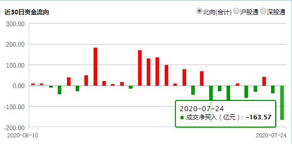 7月24日,早盘北向资金就开始持续流出,至尾盘流出金额达164.57亿元,规模仅次于7月15日的173.84亿元,当天wind全A指数下跌4.84%,今天该指数下跌4.56%。