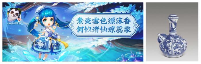 同时,《神武4》双端产品以广东省博物馆馆藏文物“青花树石纹军持”为原型,创作全新游戏宠物“青瓷姬”,以直观的视觉设计向游戏玩家传达“军持”的设计特点。