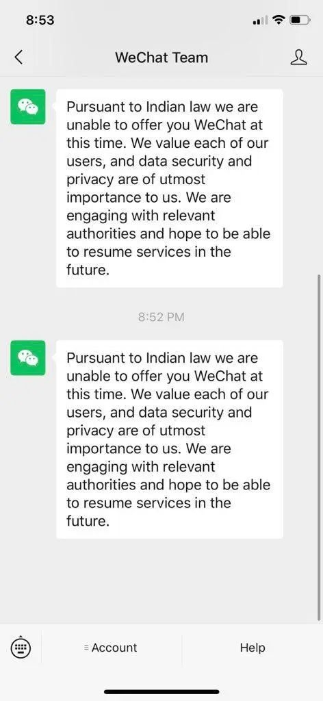 在给用户的通知中,微信官方称,“根据印度法律,我们现在无法为你提供微信服务。我们重视每一个用户,数据安全与隐私对我们来说是最重要的。我们正在与相关部门交涉,希望未来能够恢复服务。”