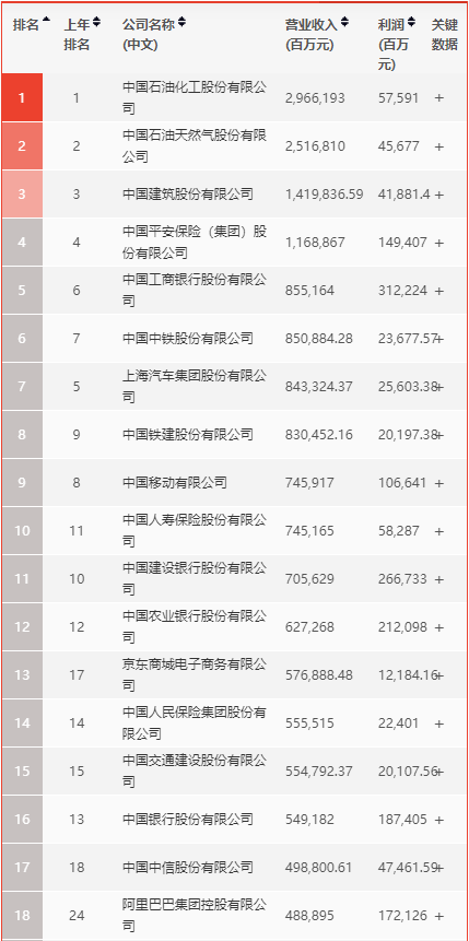 7月27日上午,财富中文网发布了2020年《财富》中国500强排行榜:中石化、中石油、中国建筑、中国平安、中国工商银行依次位列前五名。