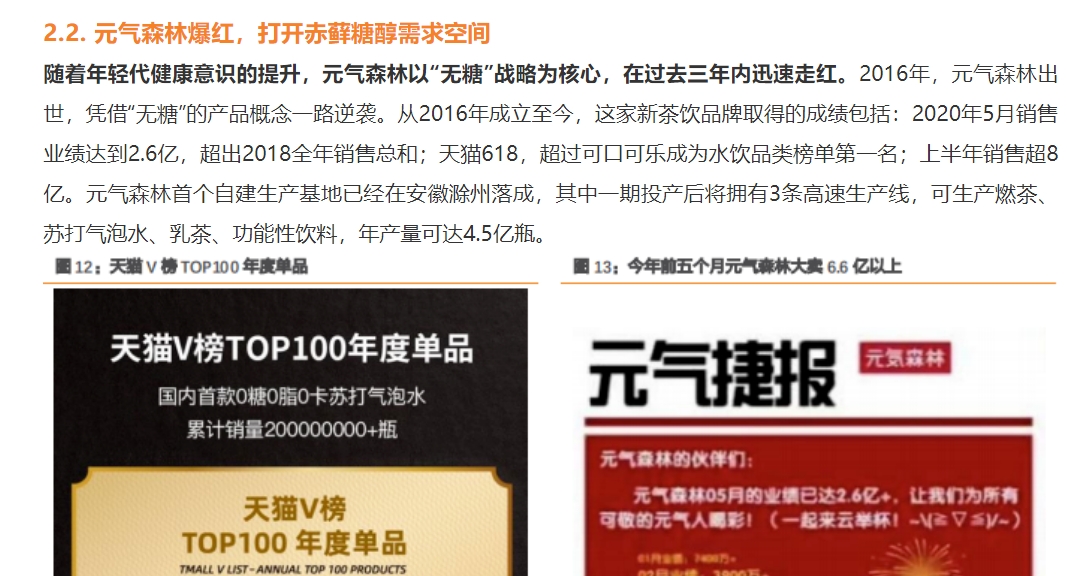天风证券在近日的研报中分析指出,元气森林爆红,打开了赤藓糖醇的需求空间。